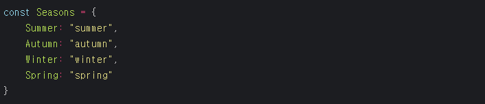 javascript에서 enum을 구현하는 방법들 C#이나 Java와 같은 다른 언어와 달리 자바스크립트는 열거형에 대한 기본 지원을 제공하지 않는다.자바스크립트에서 enum을 구현하는 방법은 여러 가지가 있다. 각 구현에는 고유한 장단점이 있다. Javascript에는 enum이라는 예약된 키워드가 있지만 현재는 언어에서 어떤 용도로도 사용되지 않는다. 향후 사용을 위해 예약되어 있을 뿐이다. enum을 객체 키로 정의해서 구현하기enum의 기본 구현을 위해 enum 유형을 캡슐화하는 객체를 정의하고 각 열거형 값에 대한 키를 할당할 수 있다.예를 들어, 각 계절을 키로 하고 대표 문자열을 값으로 하는 객체로 계절을 표현할 수 있다. 숫자를 값으로 사용하여 이를 수행할 수도 있다. 이 방법은 ..