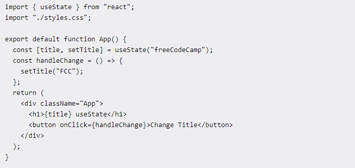 useState() 메서드는 state 변수와 해당 state 변수를 변경하는 함수의 두 값을 제공한다. 위의 코드에서는 페이지 제목을 저장하는 타이틀 상태를 만들고 있다. 초기 상태는 free Code Camp로 전달된다.