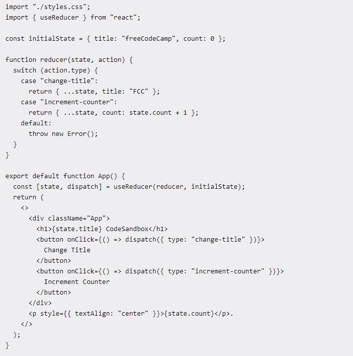 useReducer() 함수에서 반환되는 값은 state와 dispatch이다. state는 컴포넌트 내에서 사용할 수 있는 실제 상태 값이다. 이 경우 state에는 title과 count라는 두 가지 값이 있습니다. 이 제목과 카운트는 useReducer() 메서드에 의해 반환되는 dispatch() 메서드를 사용하여 조작할 수 있다.
