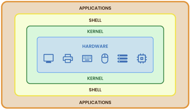 사용자는 커널과 직접 인터페이스 하지 않는다. 사용자와 커널 사이에는 셸이라고 불리는 프로그램이 있으며, 이 프로그램은 사용자의 입력을 받아 그것들을 커널에 전달하는 역할을 담당하고 있다. 간단히 말해서 셸은 키보드에서 명령어를 꺼내 커널에 전달하고 실행하는 프로그램이다. 사용자와 커널 간 인터페이스 역할을 한다.